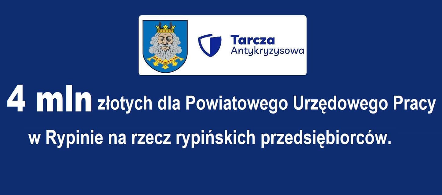 Na podstawie ustawy z 2 marca 2020r. o szczególnych rozwiązaniach związanych z zapobieganiem, przeciwdziałaniem i zwalczaniem COVID-19, innych chorób zakaźnych oraz wywołanych nimi sytuacji kryzysowych( Dz.U. poz 374, z późn. zm.) Powiatowy Urząd Pracy w Rypinie decyzją finansową z 9 kwietnia otrzymał dodatkową kwotę z Funduszu Pracy w wysokości 4 mln zł na realizację zadań określonych w art. 15zzb- 15zze ustawy.